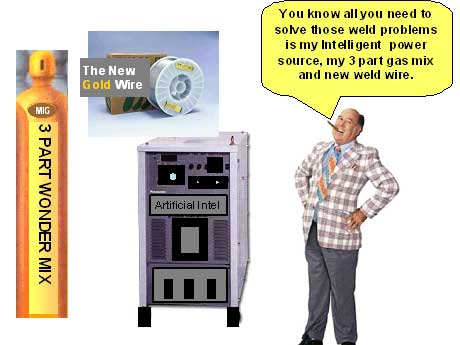 ITS AN IRONIC POINT WORTH NOTING, THAT WITH THE NUMEROUS WELD SHOPS RELIANCE ON WELD DISTRIBUTORS AND WELD EQUIPMENT & CONSUMABLE MFG. REPS FOR MIG WELD GAS AND PROCESS ADVICE, THAT FOR MORE THAN SIX DECADES, MOST OF THE WELD DISTRIBUTORS AND REPS WERE ONLY AWARE OF THE MIG GAS MYTHS AND THE BOVINE FECAL MATTER THAT THE GAS COMPANIES FED THEM: